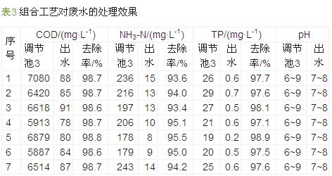 由圖3、圖4可知,MAP反應沉淀池1中NH3-N去除率>85%,TP去除率穩定在95%左右,出水NH3-N、TP分別≤500、400 mg/L。再經MAP反應沉淀池2處理后,進入調節池3的廢水NH3-N、TP分別穩定在200、30 mg/L以下。由表3可知,調節池3有機物濃度較高且波動較大,但經改造后的組合工藝處理后,出水污染物維持在較低水平且水質較穩定,說明改造后的組合工藝有較強的抗沖擊負荷能力。綜合圖3~圖4及表3可知,整個改造后的工藝對COD、TP的去除率均在97%以上,NH3-N去除率也在93%以上,出水各項指標均達到化學合成類制藥工業水污染物排放標準要求(GB 21904—2008)。