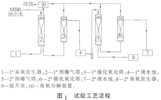 根據(jù)試驗(yàn)用水的BOD5值可知,廢水經(jīng)過(guò)A/O+MBR 的生物降解作用, 已基本沒(méi)有生物降解性了,但其COD 仍很高,而且還含有一定的氨氮,很難滿足回用的要求,因此,需要一種有效的物化方法對(duì)其進(jìn)行深度處理。根據(jù)廢水的特點(diǎn)并結(jié)合實(shí)驗(yàn)室小試的研究結(jié)果,確定采用兩級(jí)臭氧深度催化氧化法對(duì)其進(jìn)行處理,并取得了較好的處理效果。