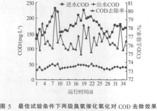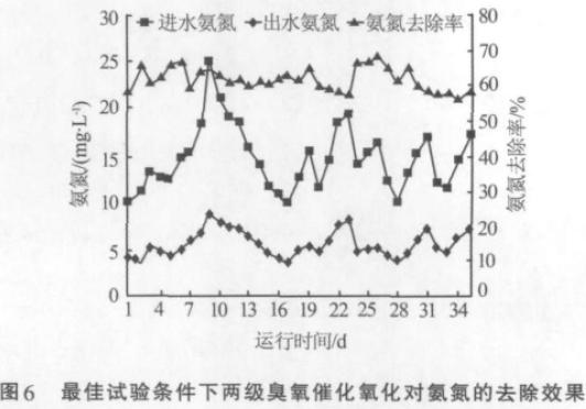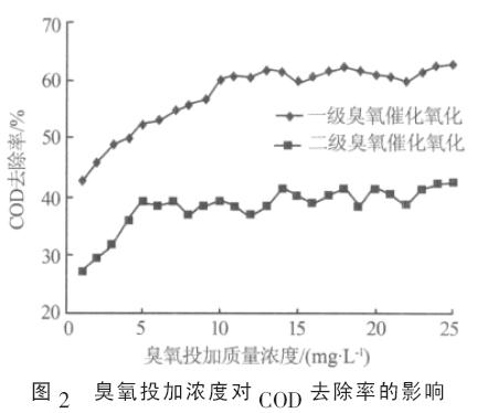 從圖2可以看出,臭氧催化氧化的COD 去除率隨水中臭氧濃度的增加而升高。但是,當(dāng)水中臭氧質(zhì)量濃度>10 mg/L 時(shí),一級(jí)臭氧催化氧化的COD 去除率不再有明顯升高,維持在60.17%左右,此時(shí)出水COD>60 mg/L,并不能達(dá)到回用要求。因此,增加了二級(jí)臭氧催化氧化進(jìn)一步降低COD。由圖2 可知,當(dāng)水中臭氧質(zhì)量濃度為5 mg/L 時(shí),二級(jí)臭氧氧化出水COD<60 mg/L,總?cè)コ蕿?5.76%,達(dá)到了回用標(biāo)準(zhǔn)要求。同時(shí),試驗(yàn)也考察了臭氧濃度對(duì)氨氮的去除效果,結(jié)果表明,隨著臭氧濃度的增加氨氮去除率也隨之增加。考慮到能耗等因素,試驗(yàn)確定兩級(jí)臭氧催化氧化的臭氧質(zhì)量濃度分別為10 mg/L 和5 mg/L。