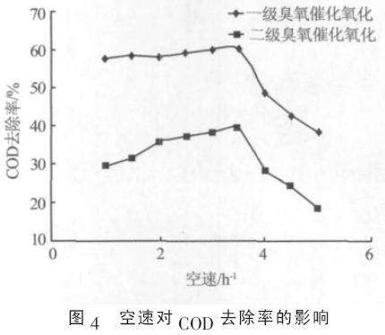 在水溫為30 ℃,兩級(jí)催化氧化的臭氧質(zhì)量濃度分別為10 mg/L 和5 mg/L,進(jìn)水pH 為7.5,催化劑裝填量為23 L 的條件下,調(diào)整進(jìn)水流量,考察空速對(duì)COD 處理效果的影響,結(jié)果見(jiàn)圖4。