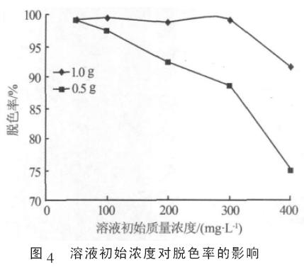由圖4 可知, 復合絮凝劑投加質量為0.5 g 時,隨溶液初始濃度的增加,脫色率呈下降趨勢;當投加質量為1.0 g 時,在溶液初始質量濃度﹤300 mg/L 的范圍內均有95%以上的脫色率,溶液初始質量濃度超過300 mg/L 以后,脫色率顯著下降。這說明單位質量絮凝劑存在一最大絮凝量, 超過此范圍處理效果下降。