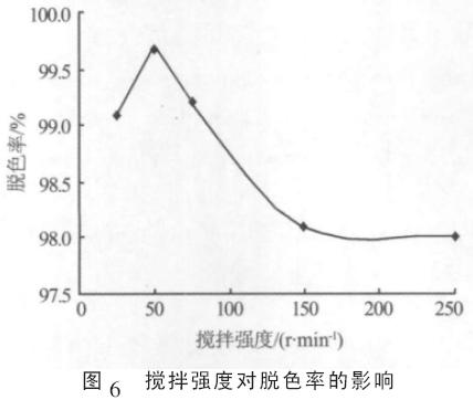 由圖6 可知,攪拌強度較小時,脫色率較高,攪拌強度在50 r/min 左右時,脫色效果最好,攪拌強度超過150 r/min,脫色率明顯下降。實驗中亦觀察到在慢攪情況下,形成的絮體較大,沉降較快;快攪情況下,形成的絮體較小,沉降較慢,這是因為水力條件對絮凝與凝聚行為影響很大。但攪拌速度太小,復合絮凝劑未能與污染物充分接觸, 自然會影響脫色效果;攪拌速度過大,絮體易被打碎,影響絮團對污染物的架橋吸附及網捕作用,造成脫色率下降。具體參見污水寶商城資料或http://www.bnynw.com更多相關技術文檔。