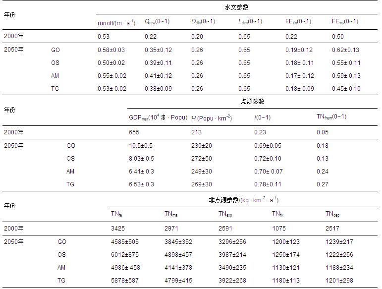 大氣氮沉降通量(TNdep):大氣氮沉降通量與能源消費量密切相關,2050年中國煤炭消耗量占全國總能耗的份額將由70%降至40%,預計未來大氣氮沉降量將有所下降.模擬了2030—2100年的全球氮沉降,研究表明,在不同的模擬情境下未來東亞地區的氮沉降約為690~1021 kg · km-2 · a-1,報道了長江流域的氮沉降為(1732±610)kg · km-2 · a-1.基于上述分析,假設2050年長江流域大氣氮沉降通量為(1500±500)kg · km-2 · a-1.