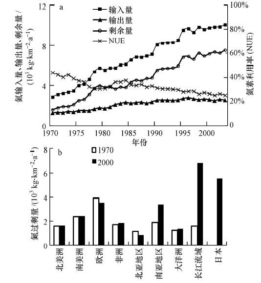圖1 長江流域氮收支平衡及與世界其他地區的比較(a)1970—2010年長江流域氮平衡(氮輸入、輸出及剩余量)以及氮素利用率(NUE)).(b)1970—2000年不同地區的氮收支平衡比較