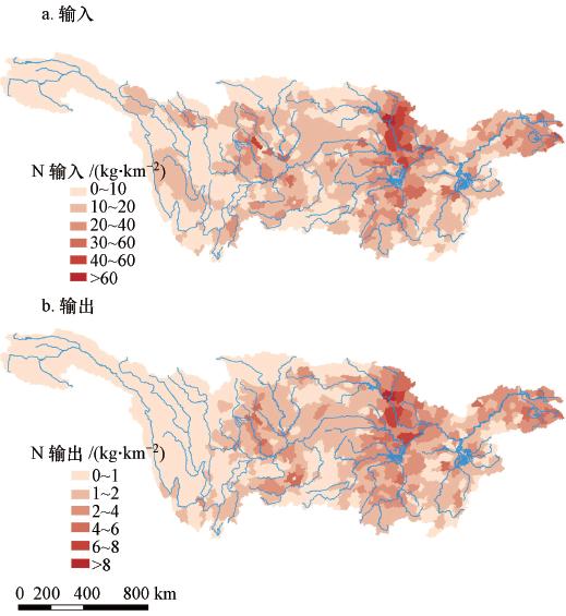圖2 長江流域2050年(4種情景下的平均值)氮輸入及DIN輸出通量的空間變化(a.流域氮輸入,b.DIN輸出)