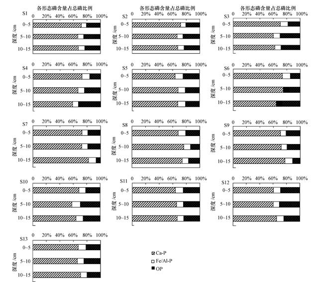 無機磷(IP)是湖泊生態系統中非常重要的磷形態.沉積物中IP平均含量達到1625.30 mg · kg-1;表層沉積物中IP平均含量最大值和最小值分別出現在S13號和S5號采樣點處,分別為3484.57 mg · kg-1和545.37 mg · kg-1,含量降幅最大的出現在S2號采樣點處,表層TP含量是沉積物底層(10~15 cm)的3.57倍,降幅達到71.96%.從圖 3d、3e和圖 4中可以得出,沉積物TP、IP含量垂向變化趨勢基本與CaP一致,而且CaP又在TP、IP中比例均達到最大,說明沉積物中TP含量主要受其中IP含量影響,而IP含量主要受其中CaP含量影響.沉積物中TP含量所表現出的“表層富集”一種普遍存在的現象,一些人認為這主要是外源污染嚴重而導致沉積物表層磷含量的增加: 還有一些人認為這可能是由于沉積物中磷的地球生物化學作用而導致其向表層遷移所致越大.TP含量在垂直距離上表現出逐漸降低的原因可能是河流流速緩慢,低棲動物較少,河流中水生植物較少,根系對沉積物中TP含量影響較小;此外,受到生活污水排放量的增加和農業面源污染加大的影響,大量的外源營養物質不能夠及時擴散被懸浮物質吸附就直接沉淀下來.