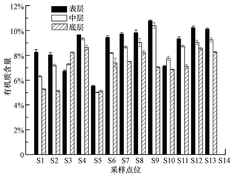 沉積物中有機質是極為重要的膠體之一,是與重金屬及其有機質污染物發生吸附、分配和絡合等作用的活性物質,同時也是反映沉積物有機營養程度的重要標志.掌下浜(北段)各采樣點位沉積物中垂向剖面上有機質含量的變化如圖 5所示.從圖 5可以看出,各采樣點沉積物中有機質的平均含量位于均7.25%~9.46%之間,比對長壽湖沉積物有機質含量研究結果高出3~4倍,與對南四湖沉積物有機質含量研究結果相似,與對太湖西岸湖濱帶沉積物有機質含量研究結果相似但變化范圍相比較小.在現場采樣時發現各采樣點河流均淤積嚴重,黑臭底泥淤積最嚴重的可達1 m以上,沉積物中有機質的重要來源有可能是河流兩岸的生活污水、農業退水和各種生物殘體的分解.除S3、S5、S10采樣點外,其余采樣點沉積物中有機質含量均隨沉積深度的增加而降低,其中,降幅最大的出現在S2號采樣點處,由表層的8.05%降到底層的5.14%;此外,表層有機質含量最大值同樣出現在S9號采樣點處,表層最小值出現在S3號采樣點處,有機質含量僅達6.72%.由表 2可知,沉積物中有機質與各形態磷的相關性并不一致.沉積物中有機質在空間分布上與TP與IP含量均具有顯著的相關性(p<0.01),相關系數分別為0.94和0.92,說明沉積物中LQI的礦化分解過程中產生的有機酸與其他的螯合劑將部分無機固定態磷釋放為可溶態的磷,有機質中富里酸聚陰離子與磷酸鹽陰離子產生吸附競爭,通過專性吸附進入礦物離子,由此促進沉積物中磷的釋放.此外,沉積物中有機質含量與CaP也顯著相關(p<0.05,n=13),與OP和Fe/AlP的相關性不顯著,表明沉積物中TP含量主要來自于CaP,其次是Fe/AlP和OP.