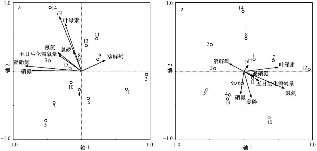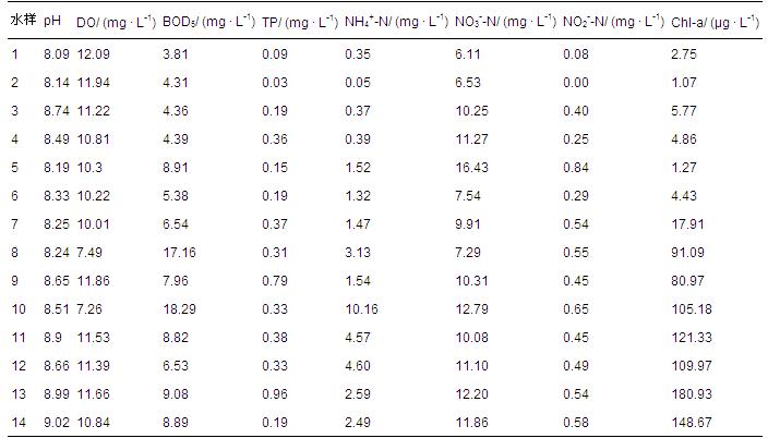 使用便攜式水質測定儀(Thermo Orion Star,賽默飛世爾科技有限公司)現場測定水溫、pH和溶解氧(DO).于實驗室內,按照文獻方法測定以下主要水質污染指標:五日生化需氧量(BOD5)、總磷(TP)、氨氮(NH4+-N)、硝氮(NO3--N)、亞硝氮(NO2--N)和葉綠素(Chl-a).