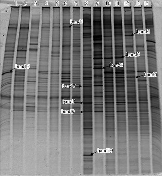 式中,pi指一種特定菌群相對總菌群的比率,pi=ni/N,ni為第i條條帶的強度,N為所有條帶強度之和,S為每條泳道DGGE條帶的數目.