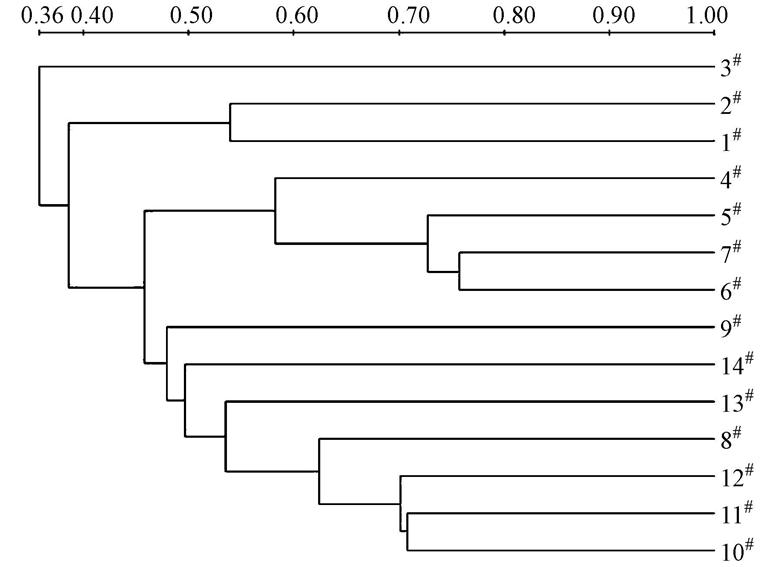 聚類分析結果如圖 3所示,可知14個底泥樣品中細菌群落大致可分為4個大簇.其中,章黨大橋(3#)與其它樣品的差異較為明顯,這可能與其周邊的啤酒廠有關.由于啤酒廢水成分與其它排放到渾河的污水成分差異較大,久而久之,排放到該采樣點水體中的污染物質不斷沉積到底泥中,導致底泥中的細菌群落結構發生顯著的變化;其它底泥樣品的細菌群落在系統樹上明顯分成3個大簇,結合實際的地理位置分析,可分為3段:①鄉村段:上游采樣點南雜木(1#)與社河(2#)為一大簇,兩者皆在大伙房水庫上游,其間人口密度小,沒有大型工廠等污染源,水中污染物濃度相對下游河段較低;②城市段:中游采樣點章黨河(4#)至高坎大橋(7#)為一大簇,其采樣點分布在渾河的撫順市至沈陽市段部分,受城市生活污水和工業廢水影響較大;③城鎮段:下游采樣點白塔堡河(8#)至田莊臺(14#)為一大簇,其間沒有大城市,流經的地點多為小城鎮或鄉村,污染物主要源自于農村生活污水和農業面源.各個大簇內又可細分為更小的相似性族群,而空間上相鄰的兩采樣點底泥的總細菌群落結構的相似性一般較高.