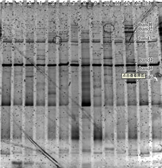 使用美國Bio-Rad公司的D-Code電泳系統進行變性梯度凝膠電泳.DGGE上樣樣品分別為細菌和古菌第二輪帶GC夾引物擴增的產物,每條泳道的上樣量均為25 μL.聚丙烯酰胺凝膠濃度為8%(丙烯酰胺 ∶ 甲叉丙烯酰胺=37.5 ∶ 1),細菌與古菌變性劑濃度梯度范圍分別為40%~60%和20%~50%.在1×TAE緩沖液中,恒定溫度60 ℃、恒定電壓70 V的條件下,電泳15 h.用SYBR gold(Invirogen,USA)核酸染料染色30 min后,拍照分析.