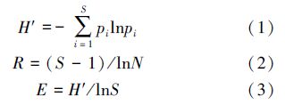 各采樣點細菌和古菌的香濃-威爾多樣性指數(Shannon-Wiener Index,H′)、種群豐度(Richness,R)及均勻度(Evenness Index,E)均通過Quantity One(Bio-Rad,USA)軟件來計算電泳條帶的遷移率灰度條帶數量得到,具體為: