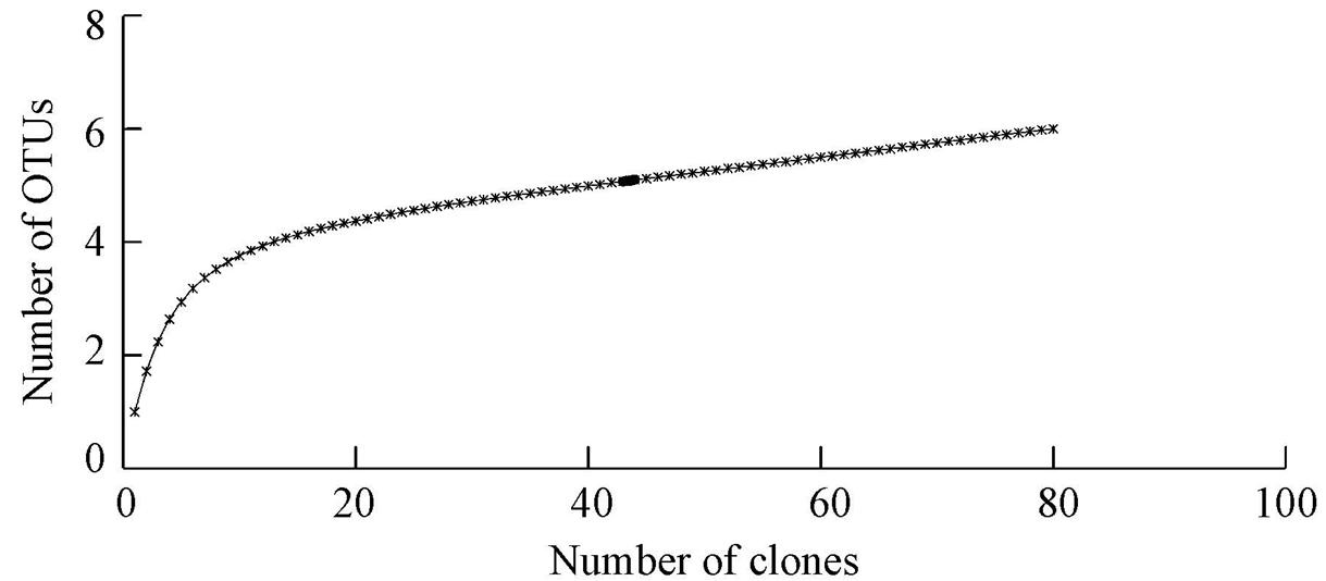 圖1 底泥中耐紅霉素細(xì)菌16S rDNA克隆文庫的稀缺性曲線