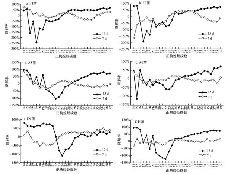 各菌株對正構烷烴的降解效果如圖 1所示.由 圖 1可看出: A5和A6的降解圖形相似,這可能與其所屬菌屬相似有關,從而攝取的碳源結構也相似(崔志松等,2010).除去D4菌株,其它菌株在7 d主要降解中低碳數正構烷烴,15 d以降解高碳數烷烴為主,而D4菌株降解情況與其它菌株正好相反.降解結果使中間碳數烷烴含量大幅增加,在C20~C24間出現降解低谷.而對于混合菌劑H(圖 1f),前7 d不管對于低碳數還是高碳數正構烷烴都具有較好的降解效果,但15 d的降解以高碳數正構烷烴為主,整個石油烴的含量呈下降趨勢.由此可見,相對于分子量較大的芳香烴污染物來說,微生物降解正構烷烴相對容易,周期較短.同時,正構烷烴降解后的產物也為微生物提供充分可利用的碳源,更有利于微生物的生長,這也是微生物對正構烷烴降解率較高的一個原因.