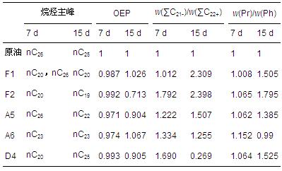 從表 2可以看出,原始油的成熟度高,經菌株作用后OEP變化不太明顯,但原始油樣的OEP值多數大于經菌劑作用7 d的原油樣品,可見各菌株在7 d降解正構烷烴時,奇數碳烷烴的降解速率大于偶數碳烷烴;而從15 d的OEP值可看出,F1和A6樣品的OEP值與原始油量相比分別為1.026和1.067,略大于原始油樣OEP值.除F1、A6菌株外,其它菌株的OEP值都小于1,且長期的OEP值均比短期的小,說明15 d這些菌劑降解奇數碳的優勢更為明顯.