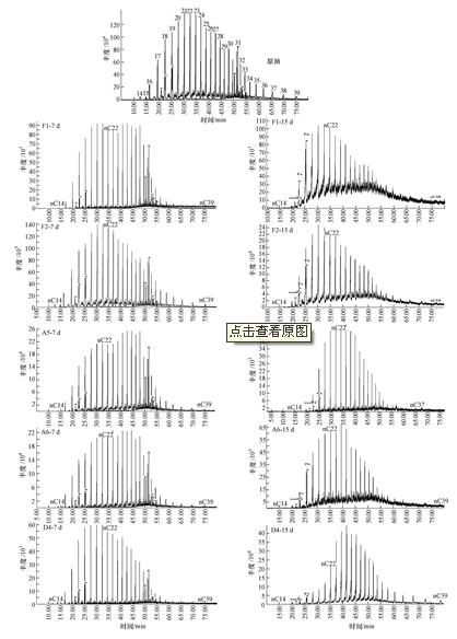F2的w(∑C21-)/w(∑C22+)值在7 d和15 d都是最大,說明F2菌劑對高碳數降解優勢最為明顯,這與表 1的結果相一致.D4菌劑在15 d的w(∑C21-)/w(∑C22+)值大幅降低(15 d的值為0.265),同樣表明D4菌劑沒有強烈降解高碳數烷烴的特征,反而有選擇性降解低碳數烷烴的能力.