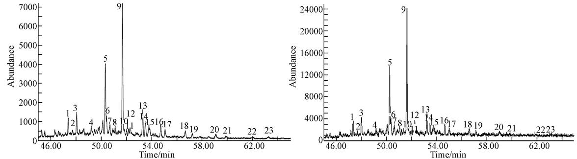 圖 4為A6降解后的藿烷(m/z191)質量色譜圖,本節僅以A6菌株為例,其他菌株霍烷圖因篇幅有限,在此不一一列舉.從A6的質量色譜圖可以更好的佐證圖 4的結果.