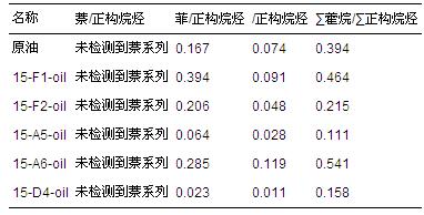 由表 2可以看出,除A6降解15 d油樣姥植比(0.99)與原油基本相近外,其它菌株對石油降解后,其w(Pr)/w(Ph)比值均大于原油,說明原油中類異戊二烯烷烴在不同菌劑的作用過程中,均發生了明顯的降解,使部分植烷脫去一個甲基轉化為姥鮫烷.