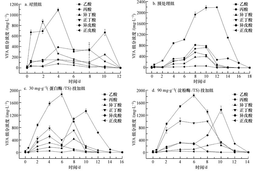 圖5 不同條件下碳源組成隨水解酸化時(shí)間的變化(a.對(duì)照組,b.預(yù)處理組,c.30 mg · g-1(蛋白酶/TS)投加組,d.90 mg · g-1(淀粉酶/TS)投加組)