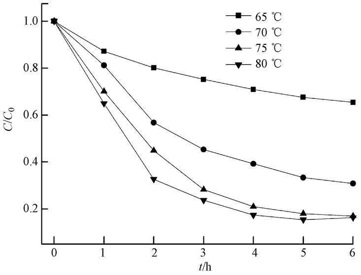 溫度是影響PS活化氧化有機物的一個重要因素,溫度對PS氧化ROC中有機物的影響效果見圖 3,在最適宜的pH和初始PS濃度條件下,選擇溫度65~80 ℃進行活化.在4 h的反應時間內,ROC的COD在65、70、75和80 ℃條件下從112 mg · L-1分別降低到84.7、42.5、21.5和19.8 mg · L-1,表明ROC的有機物去除效率隨反應溫度的增加而增加(p<0.05).溫度由75 ℃增加到80 ℃時,ROC的COD在反應的4~6 h內,COD變化不大(p>0.05),表明在此反應體系內,75 ℃溫度可以快速活化PS,考慮到經濟成本,確定本研究的適宜的活化溫度為75 ℃.