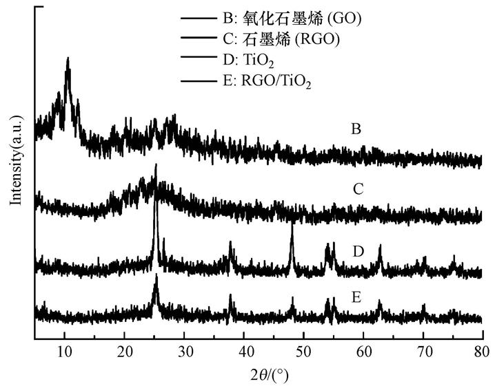 從圖 1(B)的GO圖譜可以看出,經過氧化后,只在2θ=10.2°左右出現(001)強衍射峰,由Bragg 方程計算層間距為8.6642 nm,石墨(2θ=26.5°)經過化學氧化,增加的含氧基團減弱了碳層間的相互作用,得到具有良好層狀結構的GO;圖 1(C)是經過紫外光/熱還原后的RGO圖譜,從圖中可以看出,GO的(001)特征峰消失,在 2θ=24.5°附近出現了RGO特征衍射峰.從圖 1(E)RGO/TiO2的圖譜可以看出,經過450 ℃ 高溫煅燒后,在2θ= 25.1°(101)、37.6°(004)、47.7°(200)、53.8°(105)、54.6°(211)、62.5°(204)、68.6°(116)等處與銳鈦型二氧化鈦出峰一致,復合材料晶化,由Scherrer方程計算其粒徑約為18~42 nm,但在2θ= 24.5°附近的衍射峰不明顯,這可能是由于石墨烯的含量低,衍射峰不明顯,被2θ=25.1°處的TiO2特征峰所掩蓋.