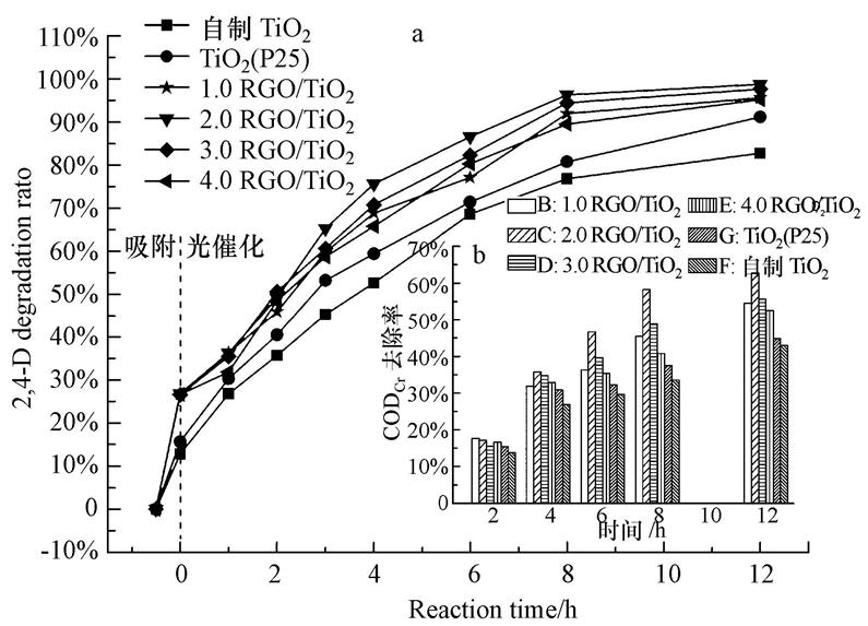 1)以Hummers法制備GO,N2氣氛中采用環保的紫外光/熱還原法能有效去除GO含氧基團,使六元碳環得到良好修復,恢復二維共軛結構制備出RGO,通過溶膠-凝膠-煅燒法450 ℃制備得到RGO/TiO2復合納米材料;負載RGO提供電子轉移高速通道,抑制電子-空穴對復合,使RGO/TiO2對2,4-D的光催化活性顯著優于純TiO2.