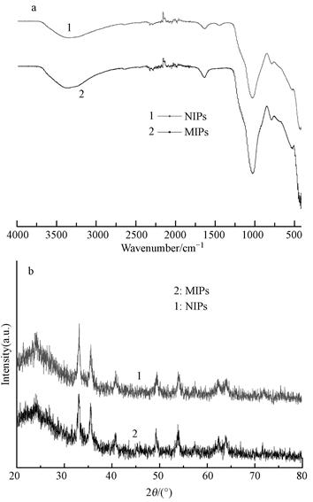 為了了解MIPs和NIPs的物相組成,我們對其進行了XRD表征,如圖 2b所示.從圖中可以看出,實驗所制備的吸附劑,在印跡前后物相組成未發(fā)生明顯改變,在2θ為26.2°、35.9°、49.4°和54.0°處出現(xiàn)與標準JCPDS卡中47-1144號SiO2相吻合的較強的特征峰,在2θ為24.2°、33.2°、35.7°和40.9°處出現(xiàn)與標準JCPDS卡中33-0664號α-Fe2O3相吻合的較強的特征峰,在2θ為21.7°、26.3°和33.7°處出現(xiàn)與標準JCPDS卡中31-0615號Fe2Al4Si5O18特征吻合的峰,說明實驗制備的吸附劑主要含有SiO2、α-Fe2O3和Fe2Al4Si5O18.