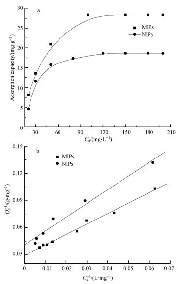 通過吸附等溫線的研究,可以探明吸附劑的吸附機理.用Freundlich等溫方程(7)、Langmuir等溫方程(8)對吸附數(shù)據(jù)進行擬合.圖 6a為不同初始濃度下對吸附AOII的研究,可以看出MIPs和NIPs對AOII的吸附量均隨初始濃度的升高而顯著增大,初始濃度為120 mg · L-1時,二者的吸附均達到飽和.通過對不同初始濃度下的平衡濃度的擬合,結(jié)果如圖 6b和表 1所示,從實驗結(jié)果(R2>0.98)可以得出MIPs和NIPs對AOII的吸附符合Langmuir吸附模型,證明所制備的吸附材料對AOII為單分子層吸附,在沒有任何其他結(jié)合力的作用下,使AOII均勻地吸附在MIPs和NIPs的表面上.