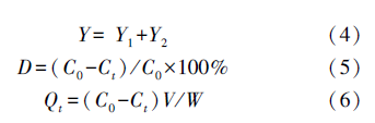 式中,Y為總COD值(mg · L-1),D為吸附率,C0與Ct分別為反應初始時與t時刻的吸附質(zhì)濃度(mg · L-1),V為溶液體積(L),W為吸附劑的量(g),Qt為t時刻的吸附量(mg · g-1).