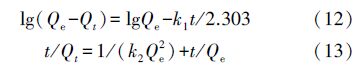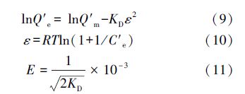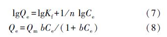式中,Qe和Ce分別為平衡態(tài)下的吸附量(mg · g-1)和質(zhì)量濃度(mg · L-1),Qm和b為Langmuir常數(shù),Kf、n為Freundlich常數(shù).