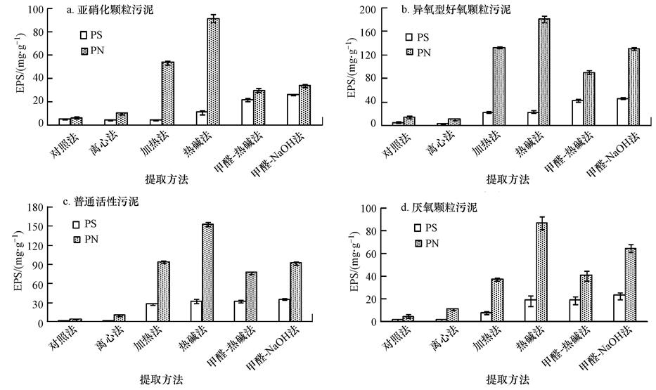 如表 2所示,對于亞硝化顆粒污泥而言,各提取方法所獲得的EPS總量遵循:熱堿法>甲醛-NaOH法>加熱法>甲醛-熱堿法>離心法>對照法.對參照污泥的提取結果也大體如此.