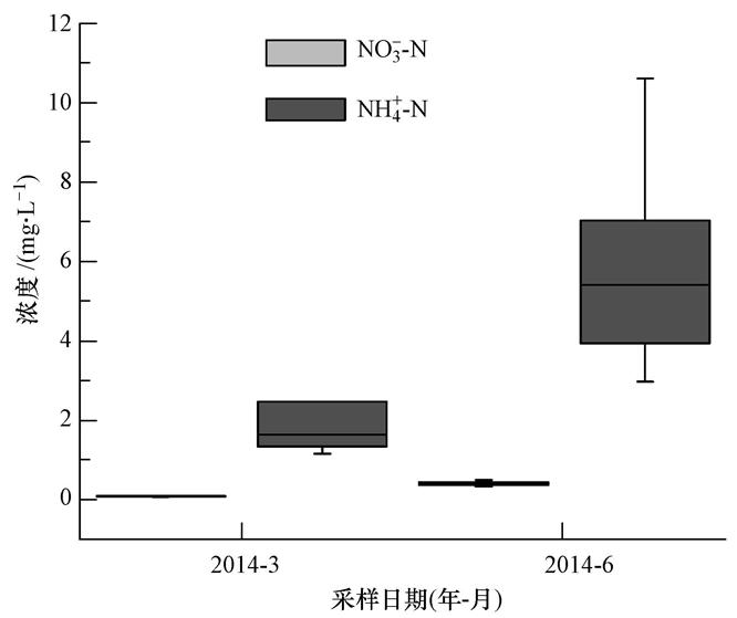 太湖西部湖區NO3--N濃度為0.99~4.43 mg · L-1,3月NO3--N濃度高于6月;NH4+-N濃度為0.13~0.65 mg · L-1,3月NH4+-N濃度高于6月.西部湖區無機氮以NO3--N為主,3月、6月NO3--N濃度分布范圍基本與入湖河流一致,NH4+-N濃度均低于入湖河流.