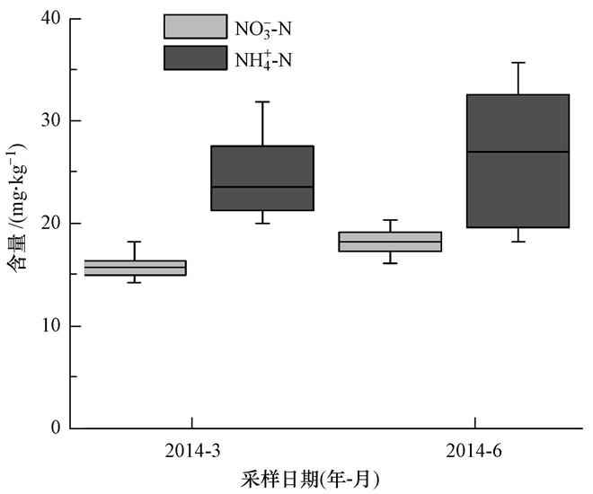 西部湖區沉積物吸附態無機氮各賦存形態含量分布如圖 4所示.由圖 4、表 1分析可知,湖區沉積物吸附態NO3--N含量為13.77~24.97 mg · kg-1,NH4+-N含量為18.20~35.70 mg · kg-1.3月、6月沉積物吸附態無機氮均表現為NH4+-N含量高于NO3--N.NO3--N與NH4+-N含量均表現為6月高于3月.