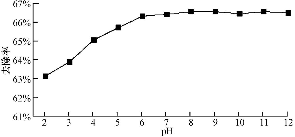 圖3 pH值對粉煤灰合成沸石除Cr3+效果的影響(Cr3+初始濃度為800 mg · L-1; 沸石投加量為5 g · L-1; 吸附時間為100 min,溫度為25 ℃)