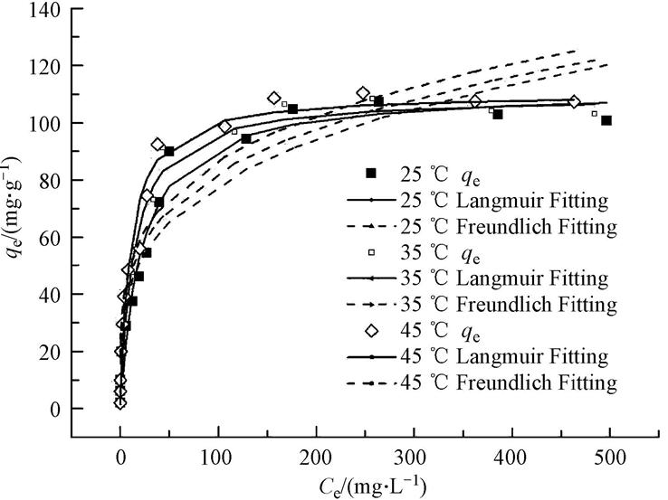 式中,b代表吸附平衡系數(L · mg-1),它與吸附的自由能有關系.Qm是最大單層吸附量.qe是平衡濃度為Ce(mg · L-1)時的單位質量吸附劑的吸附量(mg · g-1).