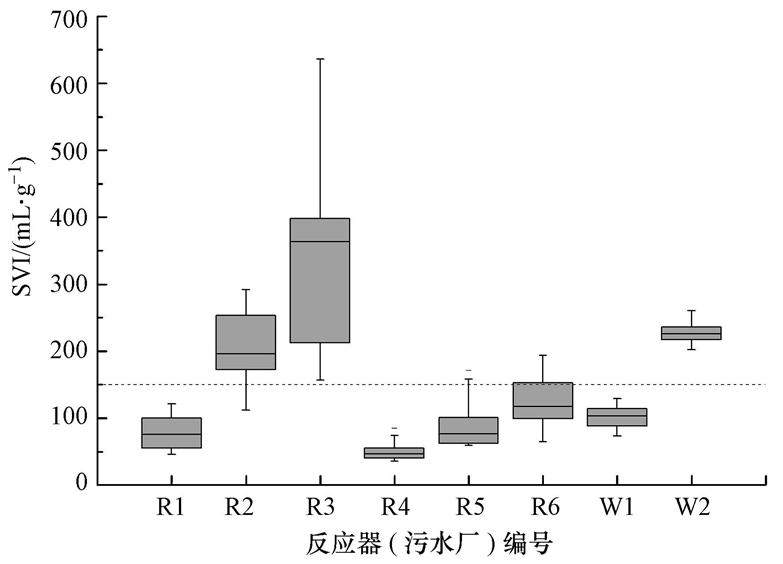 圖3 6根反應(yīng)器和2座污水廠污泥樣本的SVI箱體圖