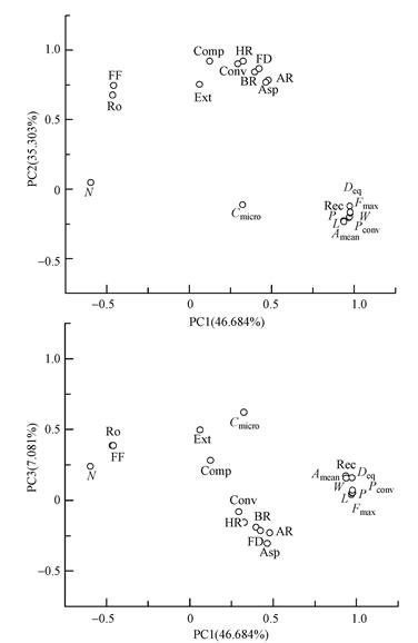 式中,Z表示對原始變量進行標(biāo)準(zhǔn)化后的值. 圖5 各微觀參數(shù)的因子載荷 PC1函數(shù)中,Amean、Rec、Pcon等大小參數(shù)對PC1的貢獻較大,因為大小參數(shù)在PC1上載荷較高,即相關(guān)系數(shù)較大,說明大小因子與絮體面積、周長、長寬等參數(shù)的變化具有同步性. 參數(shù)HR、Ro、AR、Asp、Conv、Ext、BR、FF、FD、Conv在主成分2(PC2)載荷較高,絮體密實性參數(shù)、伸長性參數(shù)和規(guī)則性參數(shù)間相關(guān)關(guān)系顯著,可歸納為污泥絮體形態(tài)因子,提取原始變量信息的35.303%,其綜合評價函數(shù)為: