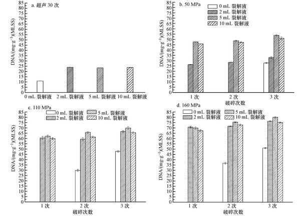 2)無論是超聲還是細胞破碎儀破碎細胞,加裂解液破碎效果比不加要好(DNA含量高),有較高的酶活力(超3~7倍).隨著細胞破碎儀破碎壓力增大,破碎效果增強,160 MPa條件下,加5 mL裂解液破碎3次效果是最好的.