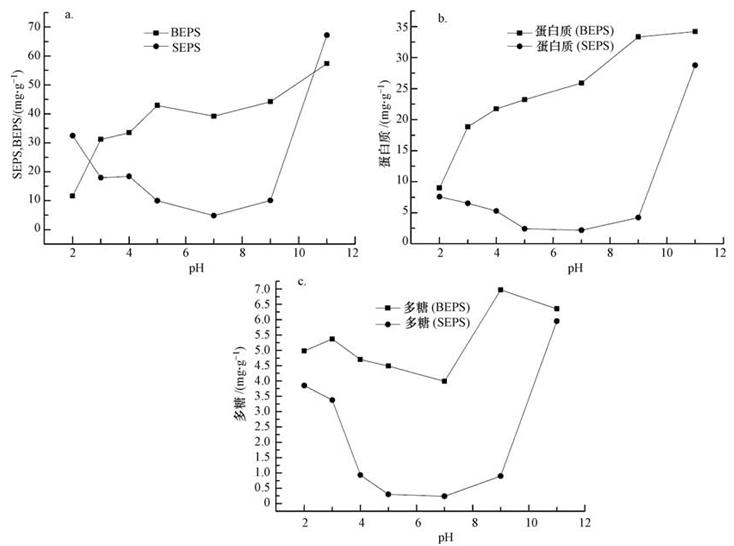 圖2 pH值對K2FeO4處理后不同EPS(a)及其蛋白質(b)和多糖(c)含量的影響(K2FeO4投加量為0.1 g · g-1,以TSS計)