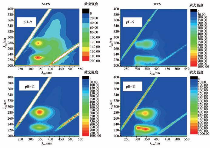 三維熒光光譜是一種高靈敏度和選擇性的分析工具,被廣泛用于天然水體中有機物的分析中,尤其在生物源物質的表征方面具有獨特的優勢.不同pH值條件下污泥SEPS和BEPS的三維熒光光譜和熒光峰強度分別如圖 3和表 2所示.首先,污泥SEPS光譜中有Peak A(λex/λem=280 nm/335 nm)—色氨酸類蛋白、Peak B(λex/λem=225 nm /340 nm)—芳香類蛋白、Peaks C(λex/λem=330 nm /410 nm)—腐殖酸和Peak D(λex/λem=275 nm /425 nm)—富里酸4個熒光峰;BEPS中僅有Peak A和Peak B兩個峰.研究顯示,當樣品的DOC濃度小于10 mg · L-1時,EEM光譜中的熒光強度可以用來定量EPS的濃度.在SEPS中,堿性條件導致SEPS中4個熒光峰響應明顯增強,而酸化處理后,兩個蛋白熒光峰強度變化不大,但腐殖酸和富里酸熒光峰強度在pH為2時明顯增強;對于BEPS,隨著pH值從2上升至11,Peak A和Peak B的熒光強度分別從48.9和76.8增加至744.7和797.6,腐殖酸和富里酸強度無明顯變化.