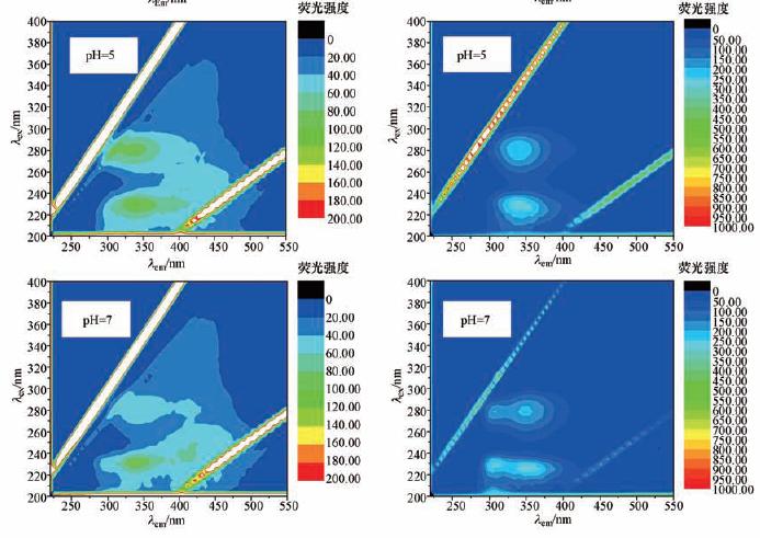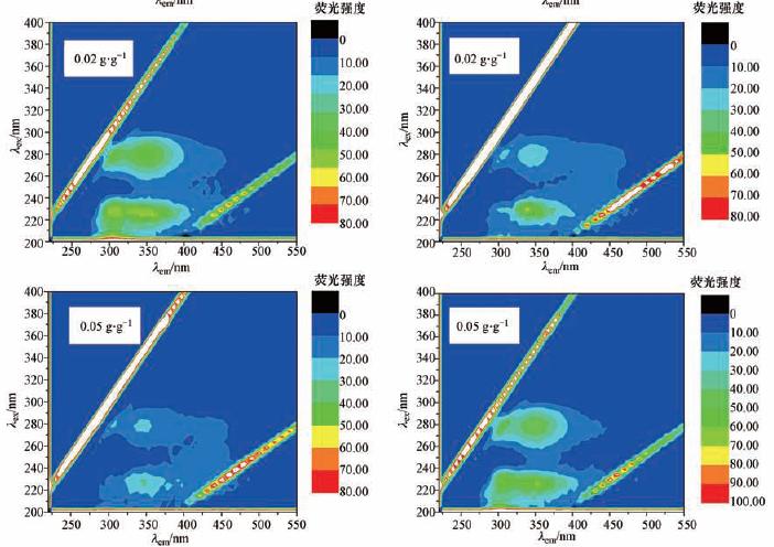 三維熒光:三維熒光光譜采用熒光光度計(Hitachi F\|4500,Japan)測定,激發波長區間為200~400 nm,波長間距為10 nm,發射波長區間為220~550 nm,波長間距亦為10 nm,光譜的掃描速度為12000 nm · min-1.Sheng等(2006)的研究顯示,熒光峰的位置、強度和不同熒光峰的強度比例均不會受到離子強度的影響.
