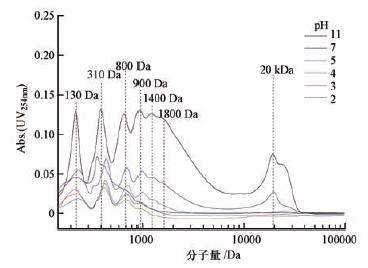 圖4 pH值對K2FeO4調理后SEPS分子量分布的影響(樣品稀釋10倍)