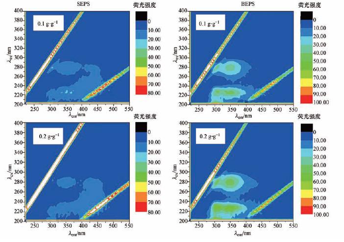 圖7 高鐵酸鉀投加量對污泥SEPS和BEPS的熒光光譜的影響(SEPS和BEPS樣品分別稀釋20和100倍)