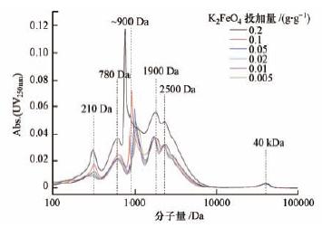 圖8 高鐵酸鉀投加量對SEPS分子量分布的影響(樣品稀釋10倍)