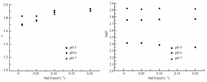 圖 2 離子強度對HA與Cd(Ⅱ)配位數和絡合穩定常數的影響(Cd(Ⅱ)10.00 mg · L-1,HA 700.00 mg · L-1)