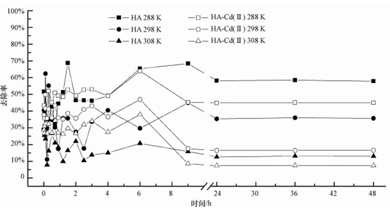 在288、298、308 K下,HA、Cd(Ⅱ)和HA-Cd(Ⅱ)在HMO表面的反應動力學結果分別如圖 3和4所示.HA與HMO在反應前9 h呈明顯波動,在9 h時,HMO對HA的去除率達到最大值,隨后逐漸降低,在反應24 h后趨于平衡.在本實驗中,比較288、298、308 K 條件下HA的去除率,在308 K時HMO對HA的去除率最低、Kd-HA值最小.此外,從圖 4中可以看出,HA和Cd(Ⅱ)二元體系中,HMO對HA的去除過程與HA單獨存在時相似,隨反應溫度升高,HMO對HA的去除率呈下降趨勢;在HA和Cd(Ⅱ)共存條件下,HA的去除率較單獨HA體系均有所下降,表明Cd(Ⅱ)與HA的絡合作用降低了HA與HMO的反應活性,導致HA去除率下降.