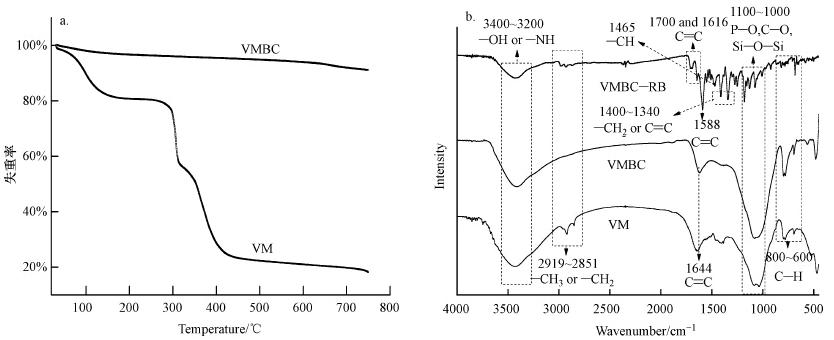 圖 1 VM和VMBC的熱重分析(a)及 VM、VMBC、VMBC-RB紅外分析(b)