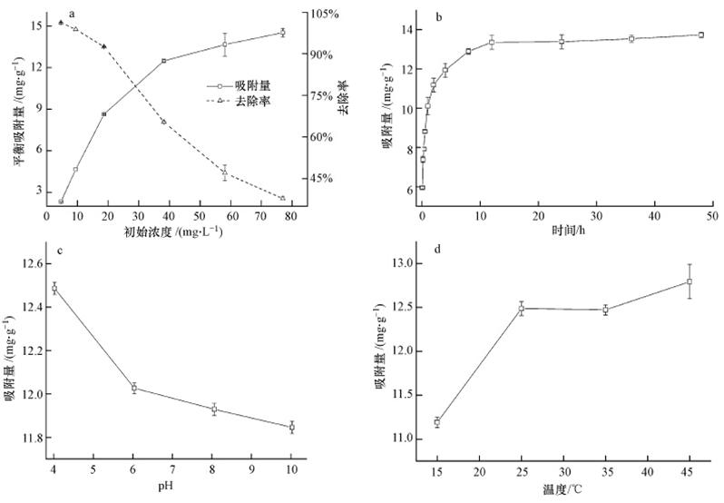 在考察RB初始濃度對吸附影響時,控制時間、pH和溫度分別為24 h、4和25 ℃,RB的初始濃度為5~80 mg · L-1;在考察時間對吸附影響時,控制RB初始濃度、pH和溫度為40 mg · L-1、4和25 ℃,時間為5 min~48 h;在考察pH對吸附影響時,控制RB初始濃度、時間和溫度分別為40 mg · L-1、24 h和25 ℃,溶液的初始pH為4~10;在考察溫度對吸附影響時,控制RB初始濃度、時間和pH值為40 mg · L-1、24 h和4,溫度為15~45 ℃.每個處理設置3個重復,并做空白參照,結果為3個重復的平均值.