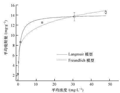 吸附等溫線常被用于探討吸附劑與吸附質之間的平衡關系.Langmuir(式(1))和Freundlich(式(2))是最為常用的吸附等溫線模型.其中,Langmuir模型表征的是單層吸附,吸附劑表面均勻同質且吸附位點之間不存在相互作用;而Freundlich模型假設吸附焓值在吸附劑表面為非均勻分配且隨表面的覆蓋度而增加.