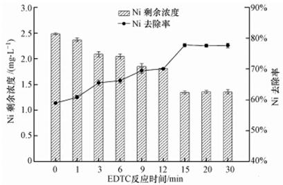 EDTC與Ni反應(yīng)迅速,反應(yīng)基本在前15 min內(nèi)完成,延長(zhǎng)反應(yīng)時(shí)間對(duì)Ni去除率的提升有限,反應(yīng)時(shí)間的長(zhǎng)短關(guān)系到實(shí)際工程應(yīng)用時(shí)反應(yīng)池容積的大小,考慮到經(jīng)濟(jì)成本,故選擇反應(yīng)時(shí)間為15 min較佳.